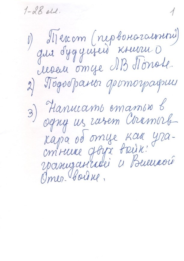 Отдельный раздел фонда составляют документы, собранные по истории семьи Поповых. Как показывает анализ документов фонда, поиск сведений о своих предках стал один из делом ее жизни. Результатом этой кропотливой и объемной работы стали две ее работы. К сожалению, они не были изданы, но в фонде отложились их машинописные рукописи с правками, сделанными рукой Р. Л. Поповой. Первая рукопись называется «Добровольным вызовом – на благо народу Коми». Вторая работа это – «текст (первоначальный) книги о моем отце черновой вариант», как отмечено самой Р. Л. Поповой, законченной за несколько месяцев до ее смерти и даже не имеющей названия [3]. На первом листе печатной рукописи имеется название «Л.В. Попов – певец природы родного края» и рукописный вариант «Л. В. Попов – участник двух войн (гражданской и ВОв).